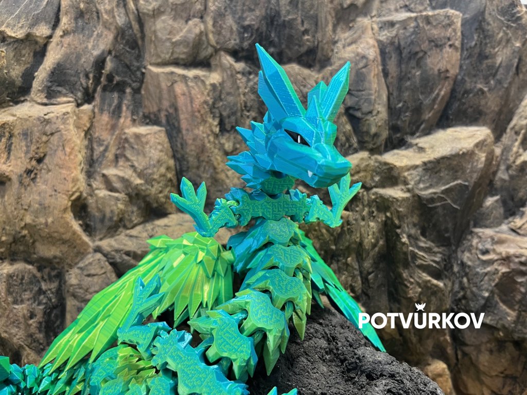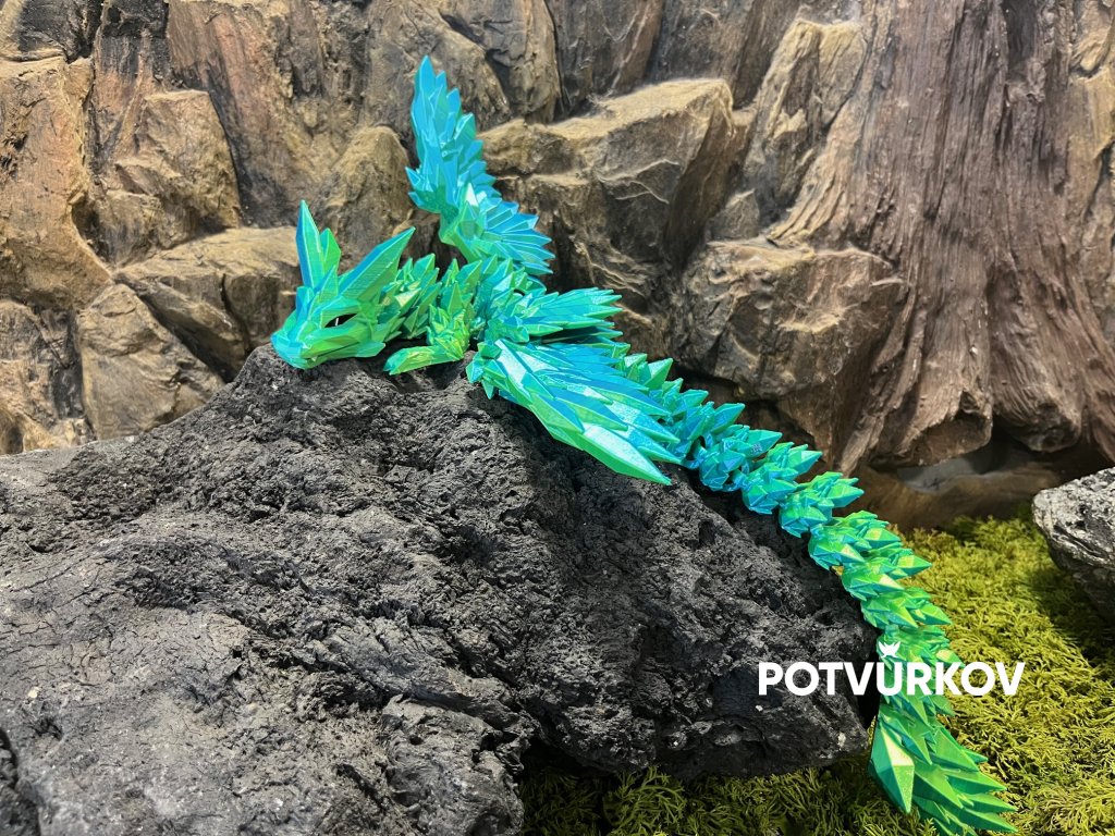 Tento majestátní krystalový drak s křídly vzniká z kvalitních filamentů a je tištěn na 3D tiskárnách Prusa. Jeho artikulovaná (flexi) konstrukce umožňuje plynulý pohyb – může se ladně stočit, rozpřáhnout křídla nebo hrdě stát na polici.