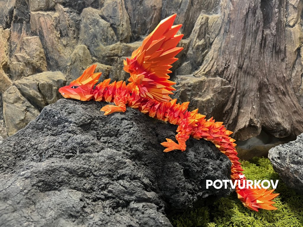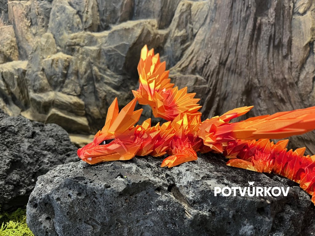 Tento majestátní krystalový drak s křídly vzniká z kvalitních filamentů a je tištěn na 3D tiskárnách Prusa. Jeho artikulovaná (flexi) konstrukce umožňuje plynulý pohyb – může se ladně stočit, rozpřáhnout křídla nebo hrdě stát na polici.