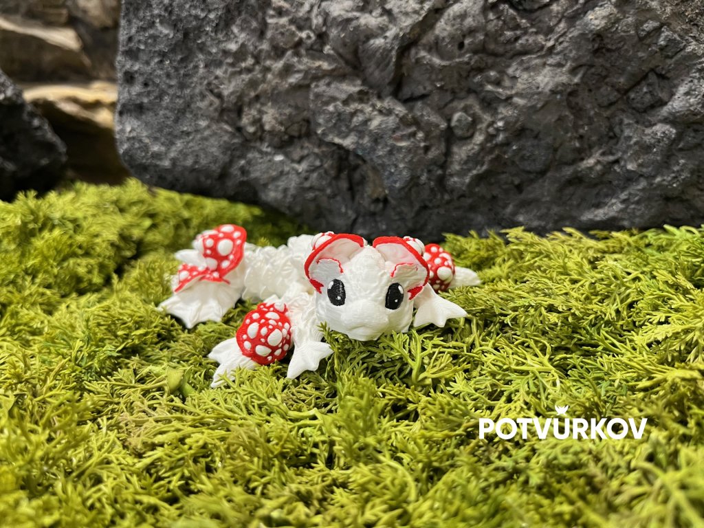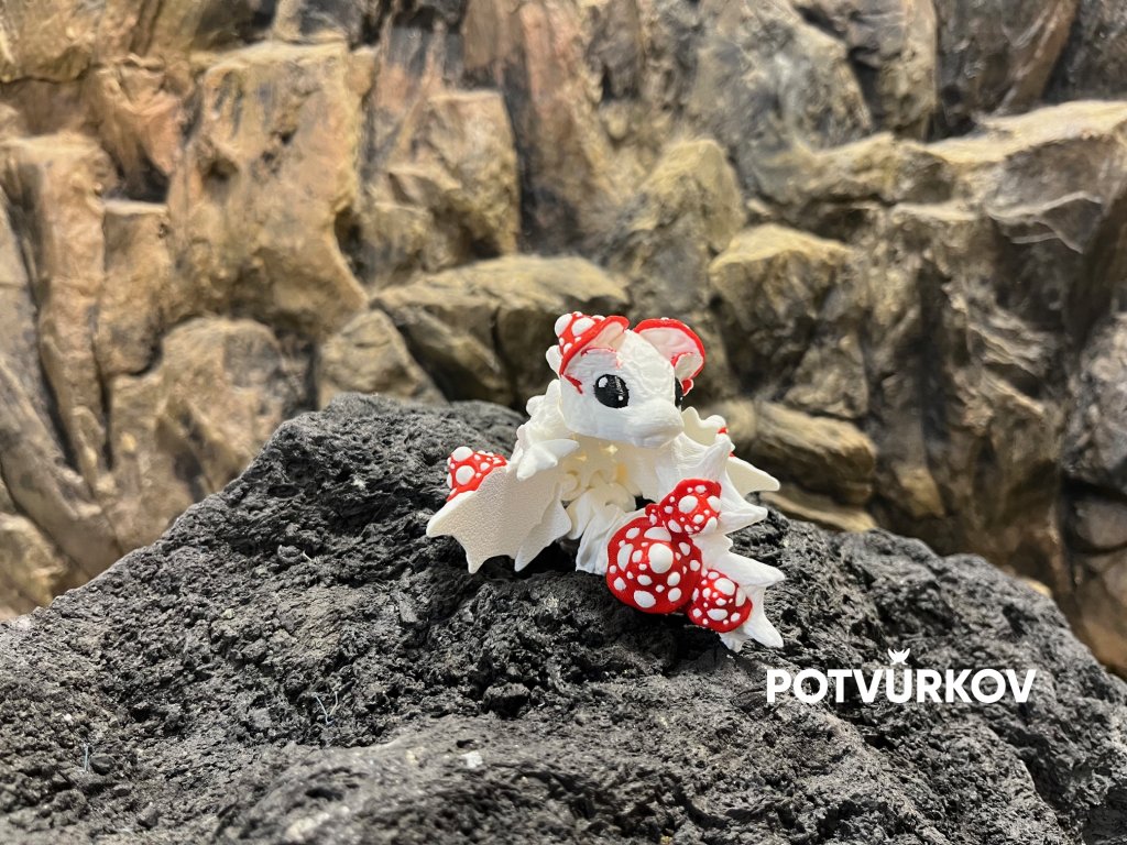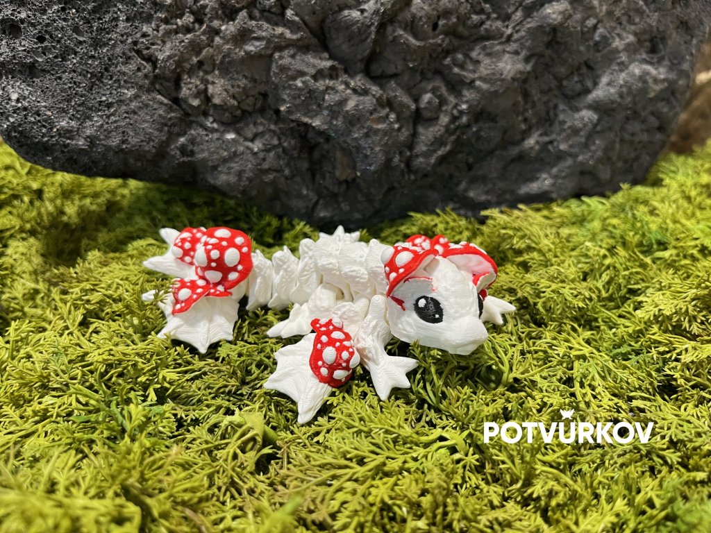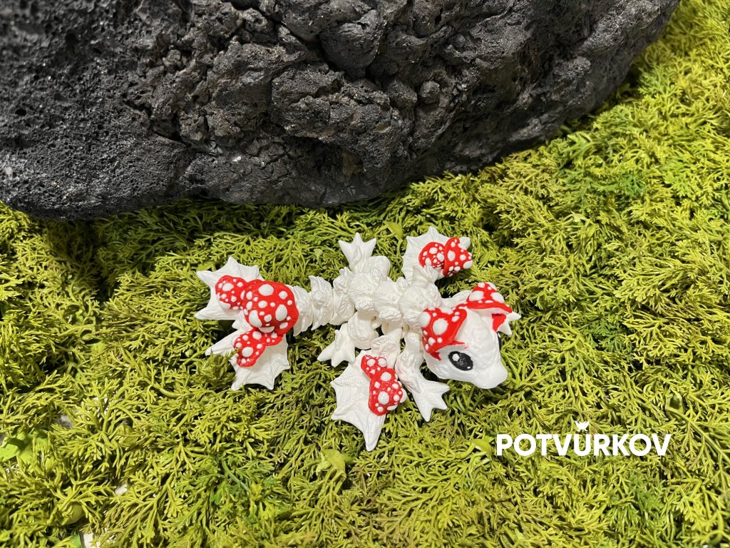 V mechu a kapradí se právě vyklubalo kouzelné dračí mládě! Tento muchomůrkový dráček má jemně bílá křídla, roztomilý kukuč a na hlavě i ocásku zdobné červené kloboučky s bílými puntíky – jako by vyrostl přímo mezi houbami v lese.