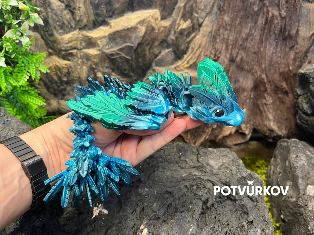 Peříčkový dráček z 3D tiskárny, který vypadá, jako by právě přiletěl z pohádkového nebe. Může se kroutit, vlnit, stočit do klubíčka… prostě dělat všechno, co správný dráček umí, když zrovna nespí na pokladu.