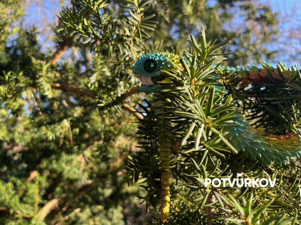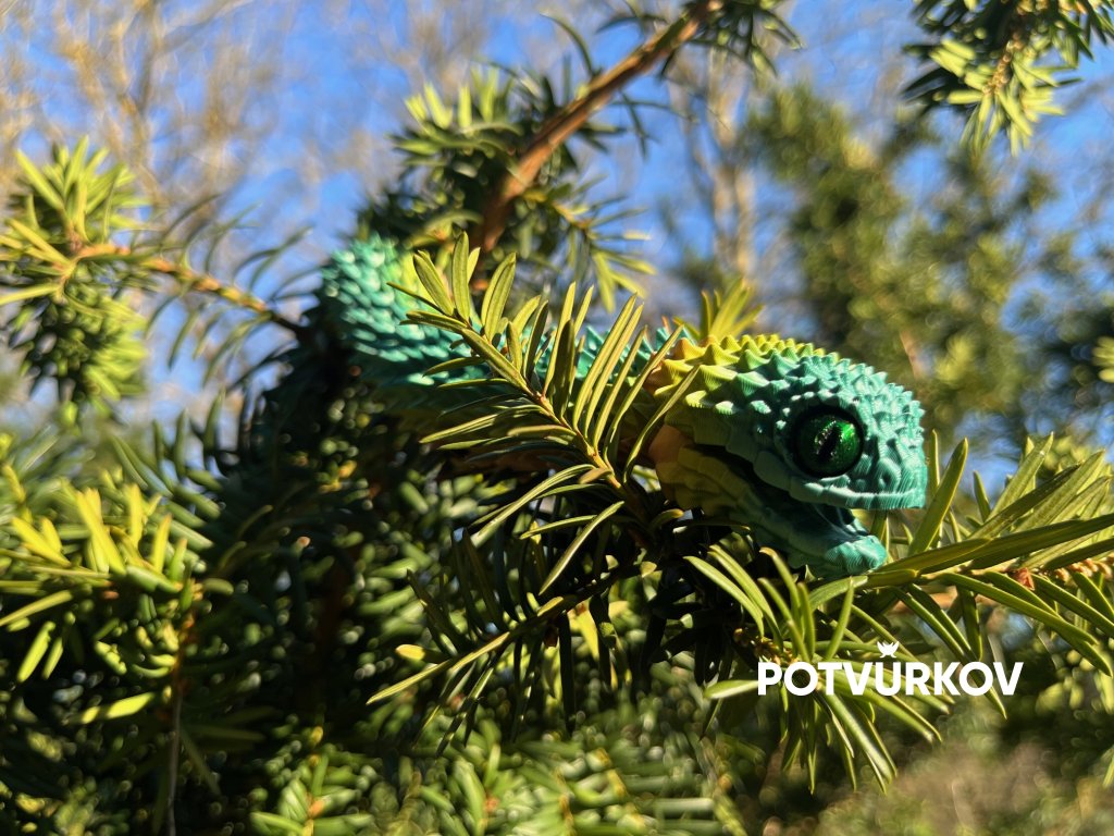 Výrazná, exotická a nepřehlédnutelná. Zmije keřová z naší Ultra realistické kolekce zaujme na první pohled výraznou strukturou „šupin“, realistickým tvarem hlavy a detailní texturou těla, která působí živě a prémiově.
